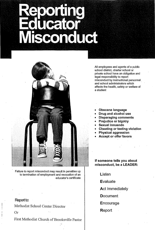 It is the desire of the MSC Faculty, Staff, and Administration to ensure the safety and well-being of all students. If any students or employees of First United Methodist School Center (MSC) feel that there has been a professional misconduct that is worthy of reporting (such as obscene language, drug/alcohol use, prejudice or bigotry, sexual innuendo or harassment, physical aggression), it should be reported immediately